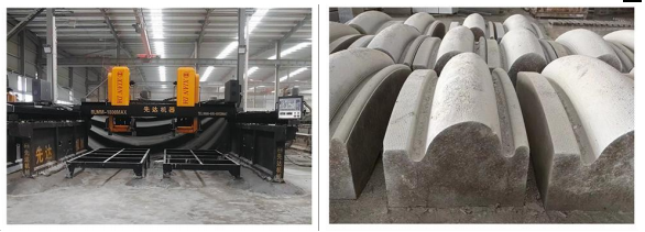 This machine adopts three-axis CNC system control, bridge double beam heavy structure, Cutting Head lifting structureuse tour quide column + sleeve copper, left rnght traveling use bottom wheel. combined the accuracy of inear quide rail and thepower o protiling machine. it has the advantages ot high stroke, hich efticiency, hich stability, tc. the system includes rougrcuting, fine cuting, fine milling and other functions, and is suitable for large-scale specia-shaped stone processing.